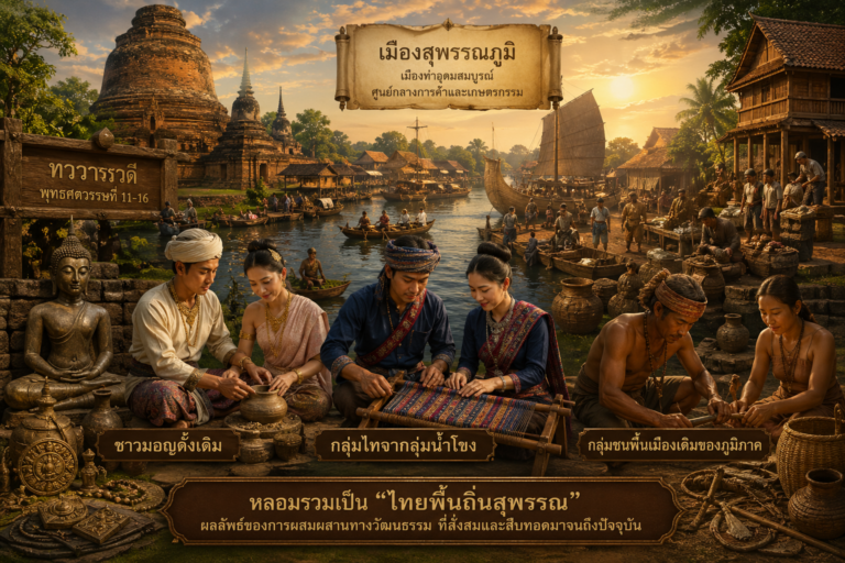 รากเหง้าแห่งลุ่มน้ำท่าจีน และแกนกลางของสังคมพหุชาติพันธุ์ บทนำ “ไทยพื้นถิ่นสุพรรณบุรี” มิใช่เพียงกลุ่มคนดั้งเดิมของพื้นที่ แต่คือ “โครงสร้างแกนกลาง” ของอารยธรรมลุ่มน้ำท่าจีน ที่หล่อหลอมวิถีชีวิต ภาษา และวัฒนธรรมของจังหวัดนี้ให้มีเอกลักษณ์เฉพาะตัว กลุ่มนี้เปรียบเสมือนผืนดินที่รองรับเมล็ดพันธุ์จากหลากหลายชาติพันธุ์ จนเกิดเป็นสังคมพหุวัฒนธรรมที่กลมกลืนและทรงพลังในปัจจุบัน ตำนานและรากเหง้า จากทวารวดีสู่สุพรรณภูมิ ตำนานและรากเหง้าของสุพรรณบุรีสามารถสืบย้อนไปถึงยุค ทวารวดี ซึ่งรุ่งเรืองในช่วงพุทธศตวรรษที่ 11–16 โดยมีชุมชนมอญเป็นฐานสำคัญของอารยธรรมในลุ่มน้ำแห่งนี้ ขณะที่ตำนานท้องถิ่นได้กล่าวถึง “เมืองสุพรรณภูมิ” ในฐานะเมืองท่าที่อุดมสมบูรณ์และเป็นศูนย์กลางทั้งการค้าและเกษตรกรรม ผู้คนที่เข้ามาตั้งถิ่นฐานในระยะต่อมามิได้เป็นกลุ่มเดียว หากแต่ค่อย ๆ หลอมรวมกันระหว่างชาวมอญดั้งเดิม กลุ่มไทจากลุ่มน้ำโขง และกลุ่มชนพื้นเมืองเดิมของภูมิภาค จนก่อเกิดเป็น “ไทยพื้นถิ่นสุพรรณ” ที่มีลักษณะเฉพาะตัว ไม่ใช่ชาติพันธุ์บริสุทธิ์ หากเป็นผลลัพธ์ของการผสมผสานทางวัฒนธรรมที่สั่งสมและสืบทอดมาอย่างยาวนานผ่านกาลเวลา การตั้งถิ่นฐาน ลุ่มน้ำท่าจีนคือหัวใจ การตั้งถิ่นฐานของผู้คนในสุพรรณบุรีมีรากฐานผูกพันอย่างลึกซึ้งกับ แม่น้ำท่าจีน ซึ่งเปรียบเสมือนเส้นเลือดหล่อเลี้ยงชีวิตและเป็นแกนกลางของภูมิประเทศมาแต่โบราณ ชาวไทยพื้นถิ่นจึงเลือกตั้งบ้านเรือนเรียงรายตามแนวแม่น้ำ…